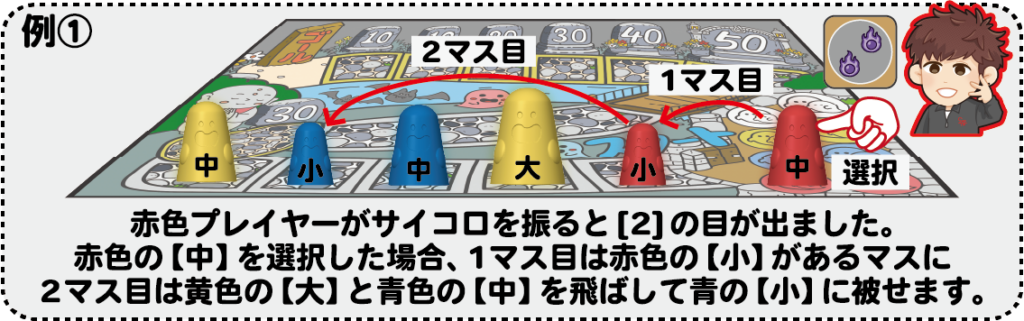 選択したおばけコマと【同じサイズ】やそれより【大きいおばけコマ】があるマスは飛ばして進めます