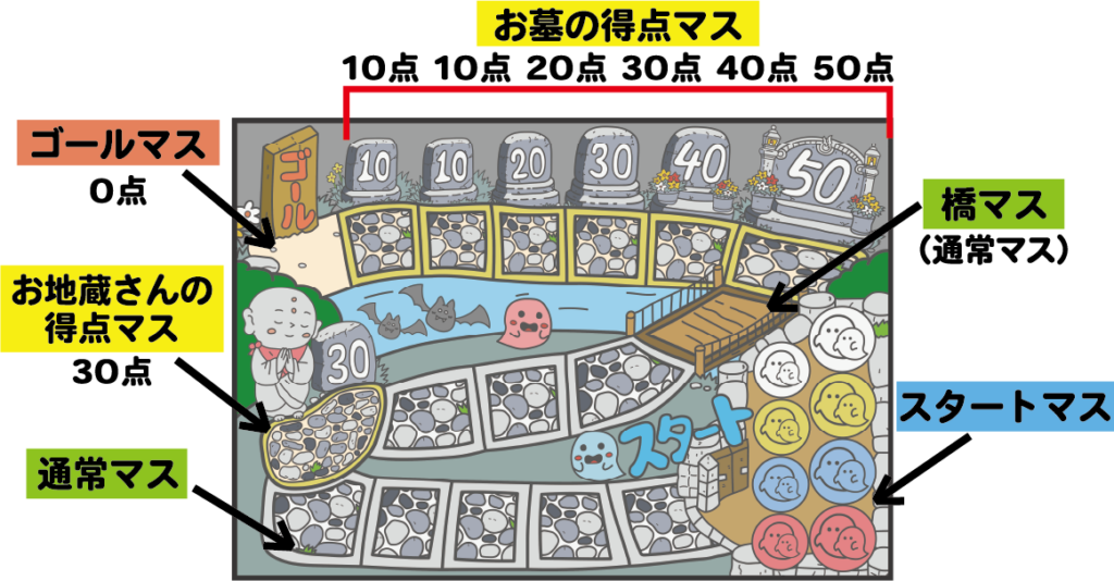 自分のおばけコマを動かし、得点マスに止まることを目指す「すごろくゲーム」です。
