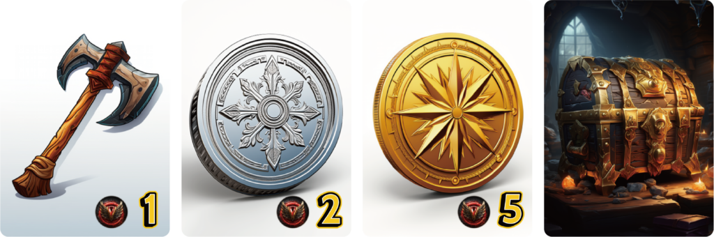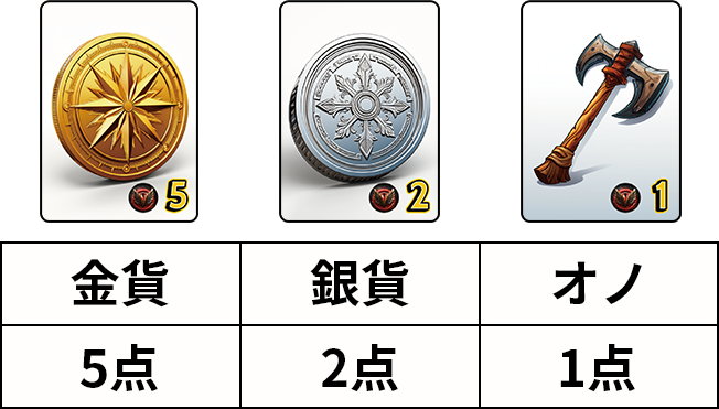 ・お宝カード:12枚(オノ:3枚 / 銀貨:6枚 / 金貨:3枚)