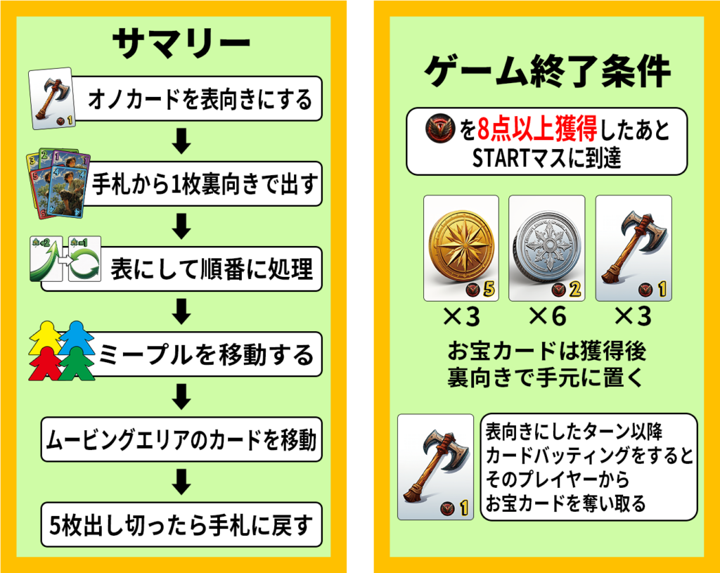 任意のターンのゲームの流れ①で表向きにします。このターン以降、オノを装備したプレイヤーはカードバッティングをしたとき、そのプレイヤーからランダムにお宝カードを奪います。奪ったお宝カードは裏向きで手元に置き、オノはゲームから除外します。