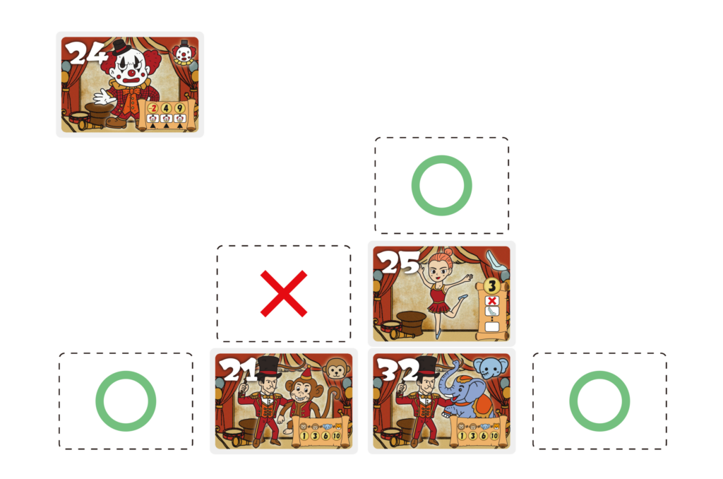例)4ラウンド目、24番のピエロを配置するときに配置可能な場所(〇)と不可能な場所(×)