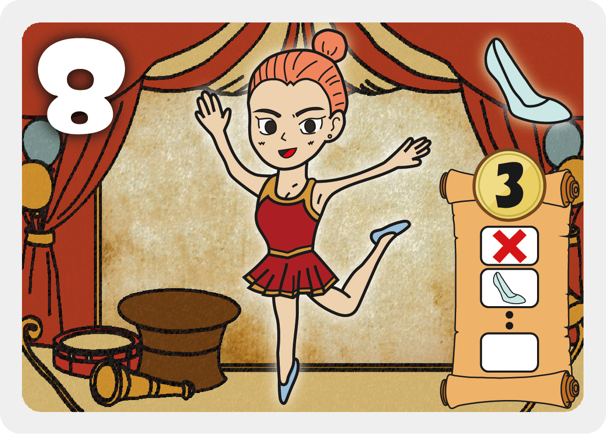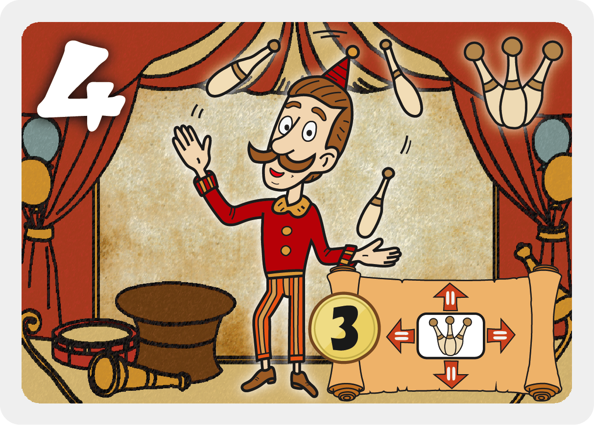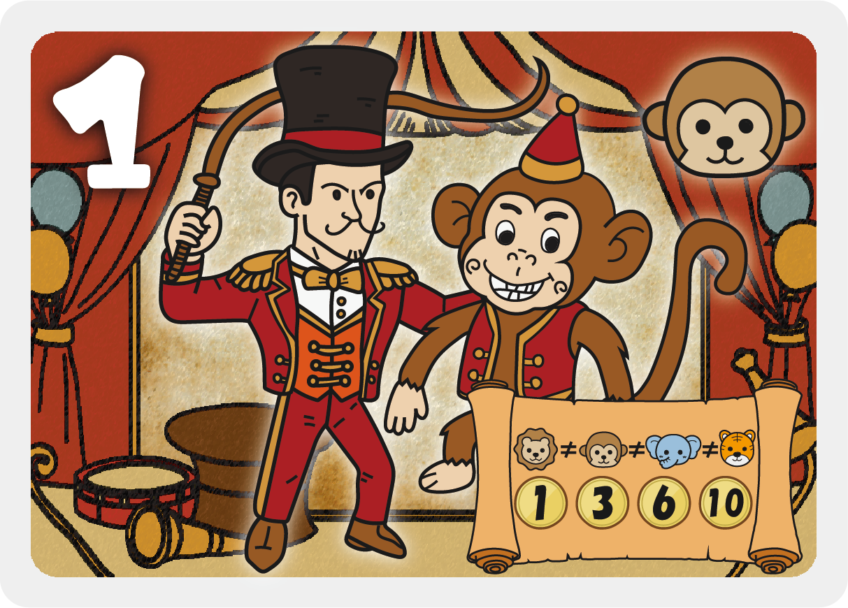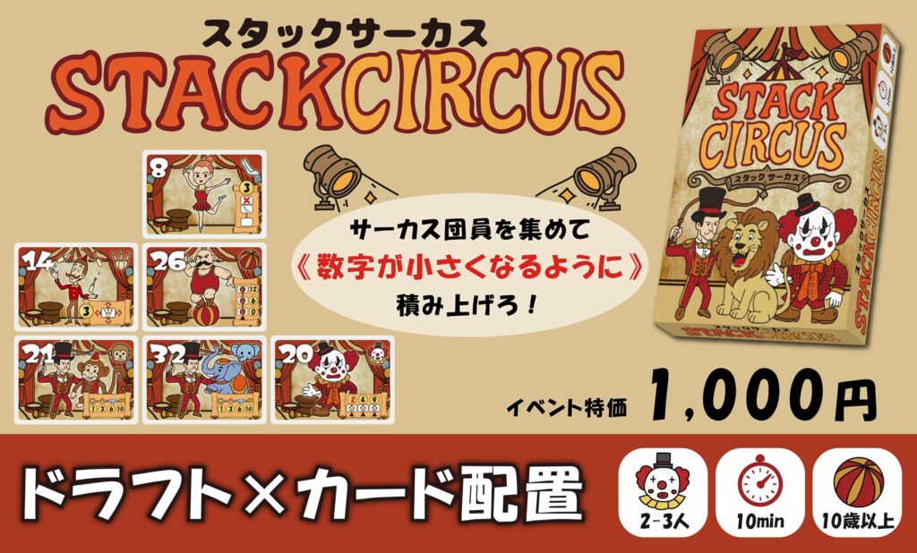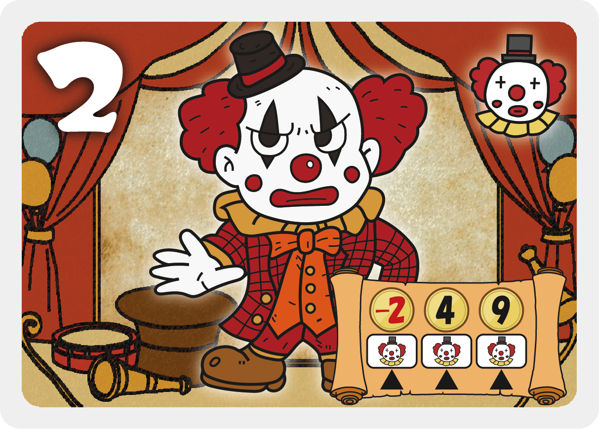 サーカス団員を集めて、数字が小さくなるように積み上げていく ドラフト×カード配置ゲーム です。