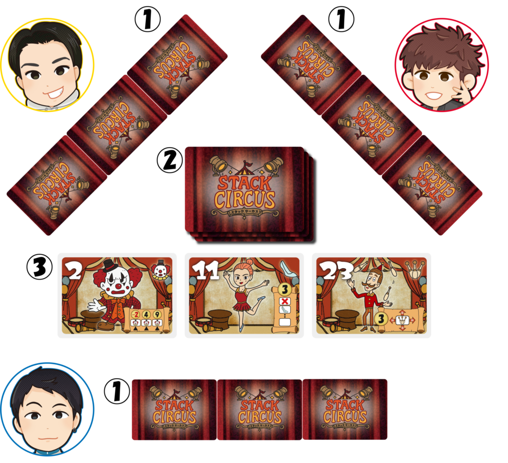 ①全てのサーカスカードを裏向きでシャッフルし、各プレイヤーに裏向きのまま3枚ずつ配ります。これを手札と呼び、自分だけが表面を確認してください。